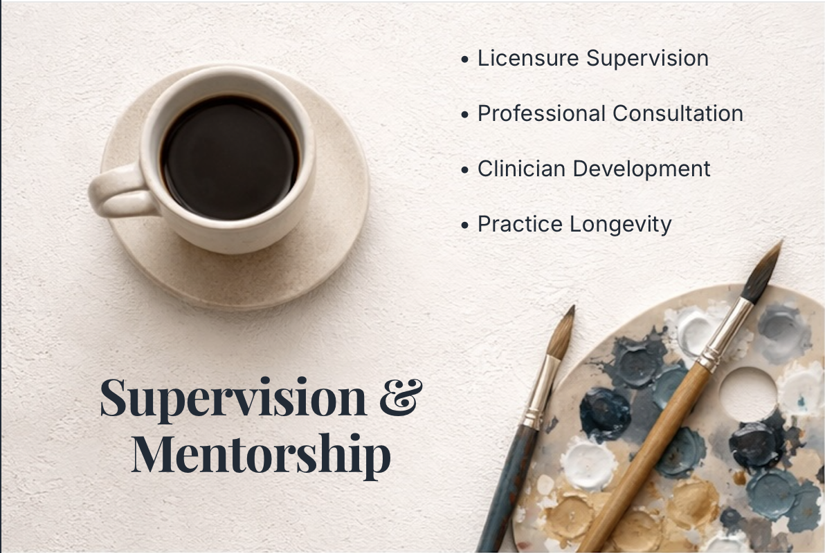 Supervision with me is not only about case consultation and licensure requirements. It’s about helping you develop a grounded professional identity that can sustain the realities of this field. Together, we strengthen your capacity to stay present with complexity, hold boundaries, and remain connected to the work without sacrificing yourself in the process.